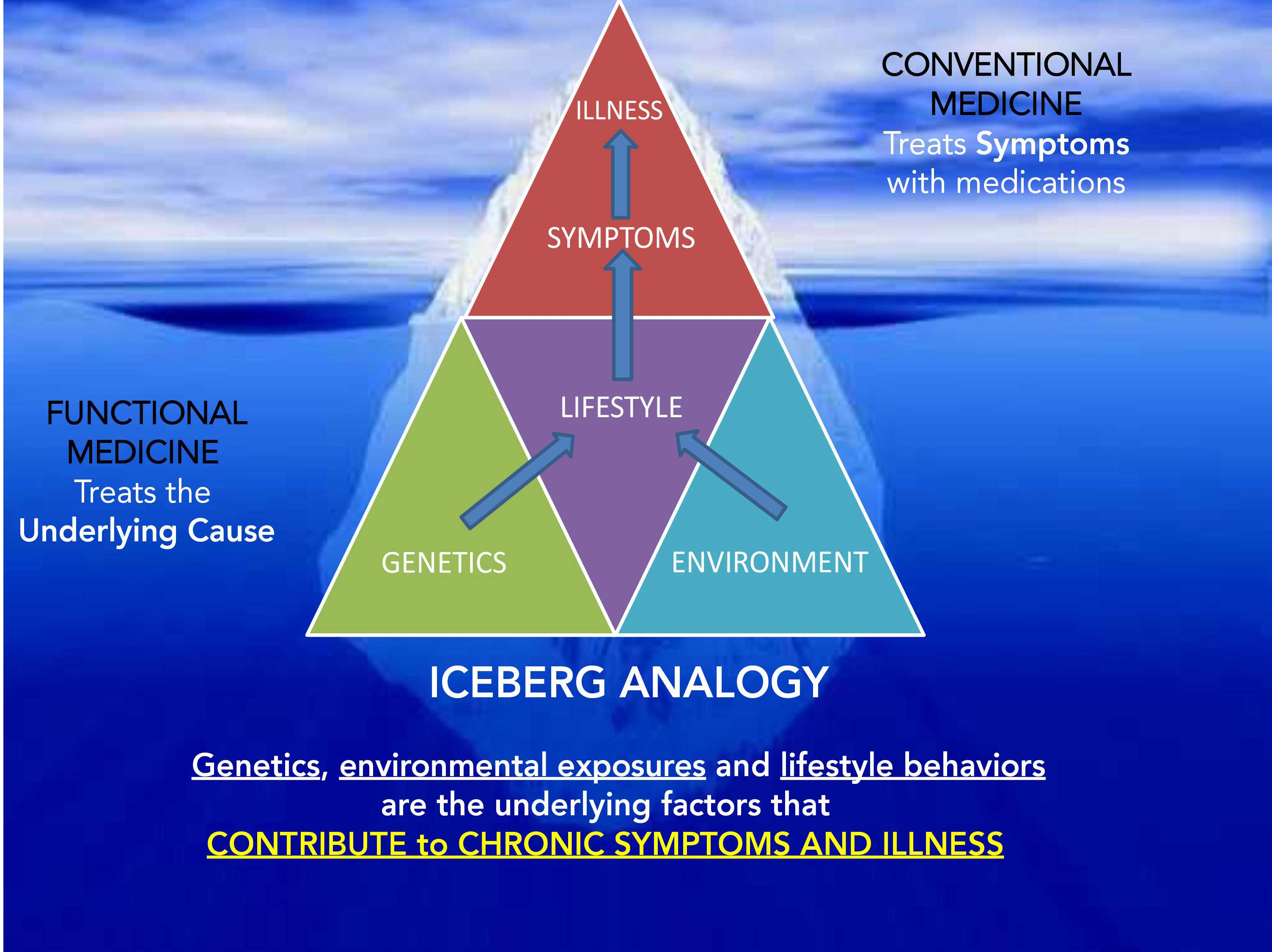 Conventional medicine focuses on naming or diagnosing disease and treating it with the appropriate drug or surgery. By contrast, the goal of Functional Medicine is to uncover the root causes of illness and then provide you with the tools to create health and vitality.